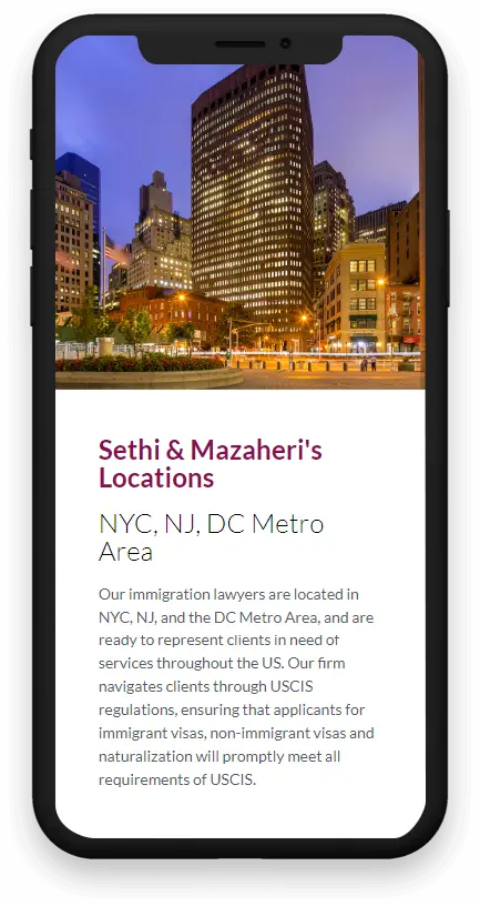 Sethi & Mazaheri’s offices are located in NYC, NJ, and the DC Metropolitan Area, and our representation of clients extends across the globe.